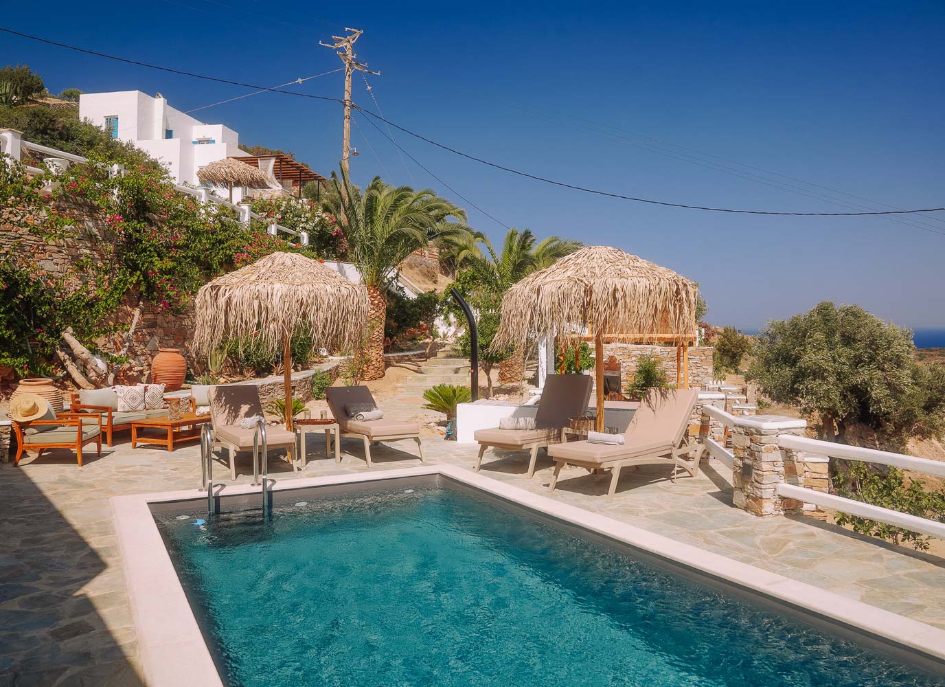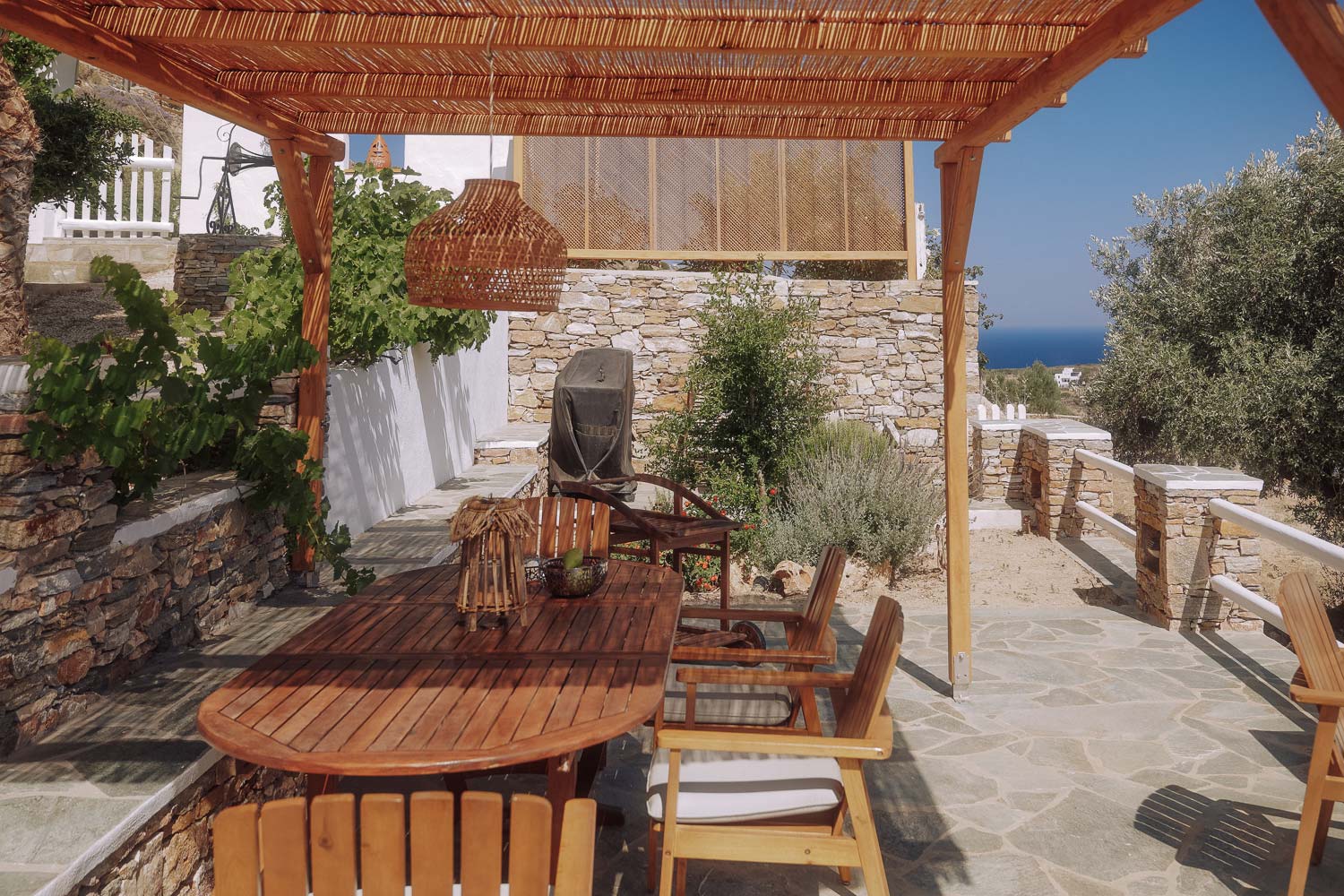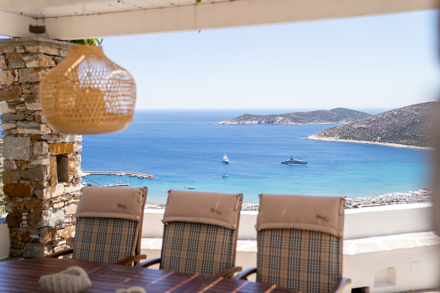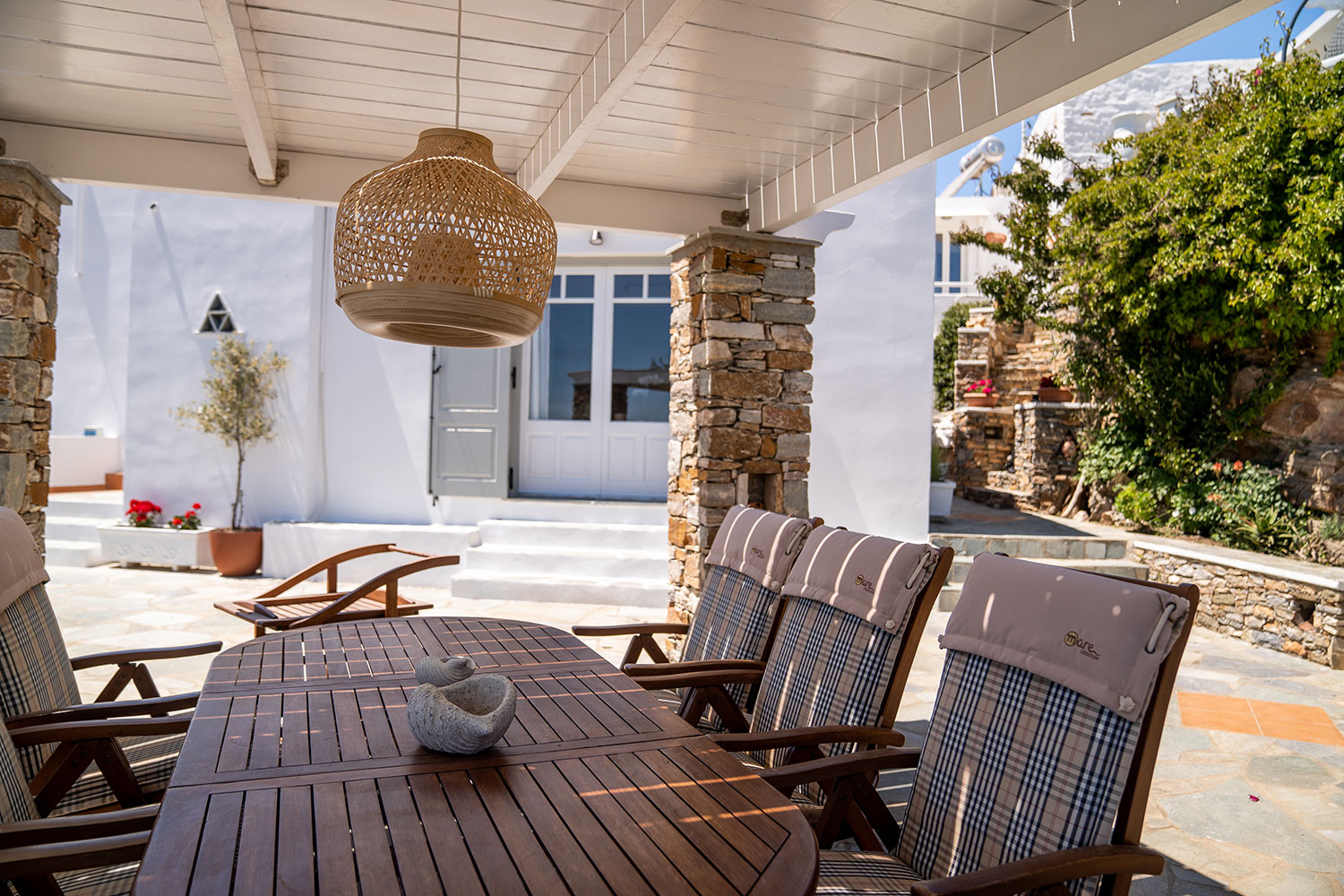 Μία μεγάλη σκιασμένη βεράντα, περιτρυγυρισμένη από φυτά και πολύχρωμα λουλούδια, με άνετα έπιπλα κι ένα μεγάλο καθιστικό εξωτερικού χώρου, προσφέρει πανοραμική θέα στον κόλπο του Πλατύ Γιαλού και στα γύρω νησιά. Δίπλα, βρίσκεται ο χώρος της πισίνας (30τ.μ.) με άνετες ξαπλώστρες για να απολαμβάνετε τον Κυκλαδίτικο ήλιο.