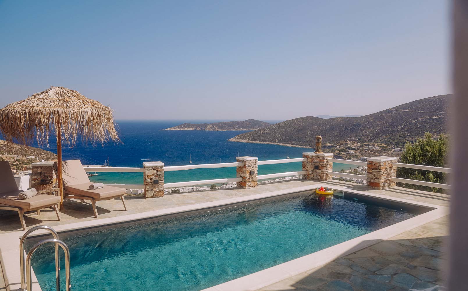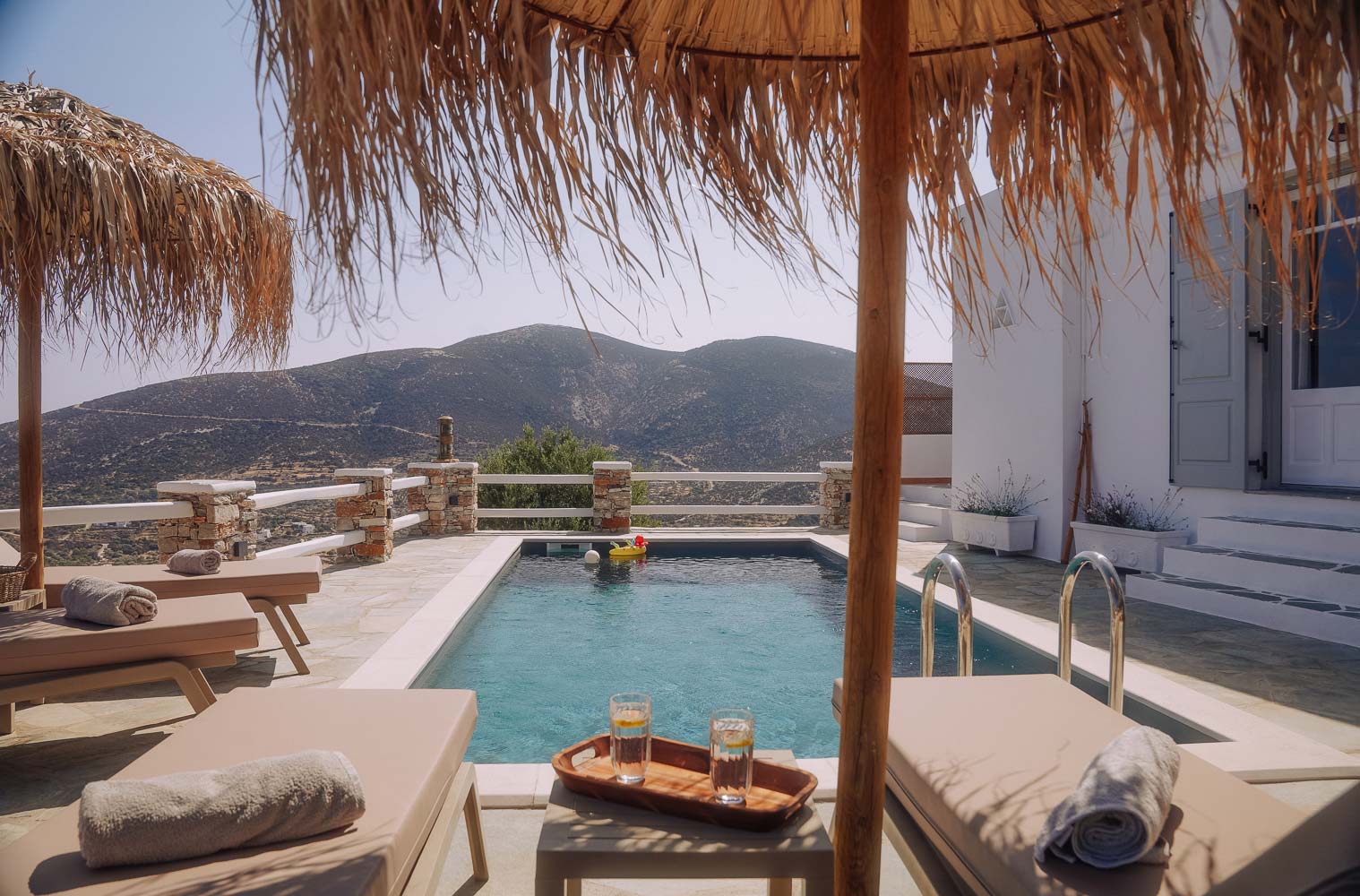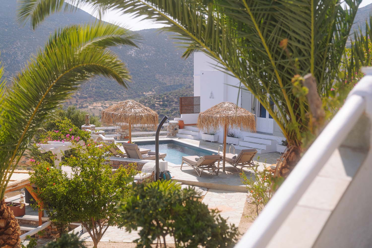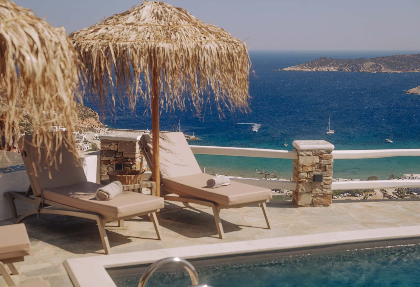 Μία μεγάλη σκιασμένη βεράντα, περιτρυγυρισμένη από φυτά και πολύχρωμα λουλούδια, με άνετα έπιπλα κι ένα μεγάλο καθιστικό εξωτερικού χώρου, προσφέρει πανοραμική θέα στον κόλπο του Πλατύ Γιαλού και στα γύρω νησιά. Δίπλα, βρίσκεται ο χώρος της πισίνας (30τ.μ.) με άνετες ξαπλώστρες για να απολαμβάνετε τον Κυκλαδίτικο ήλιο.