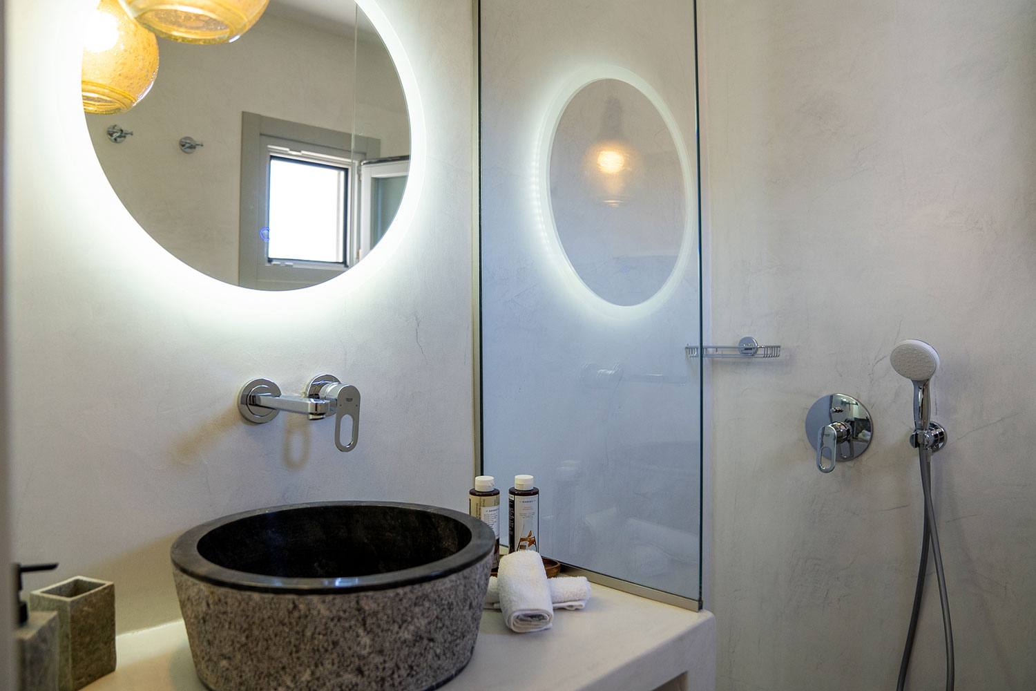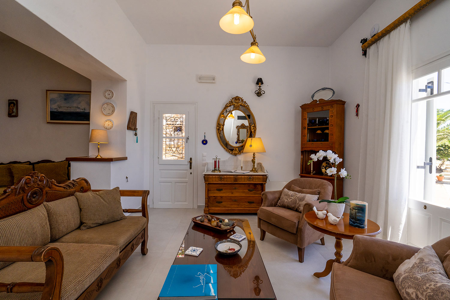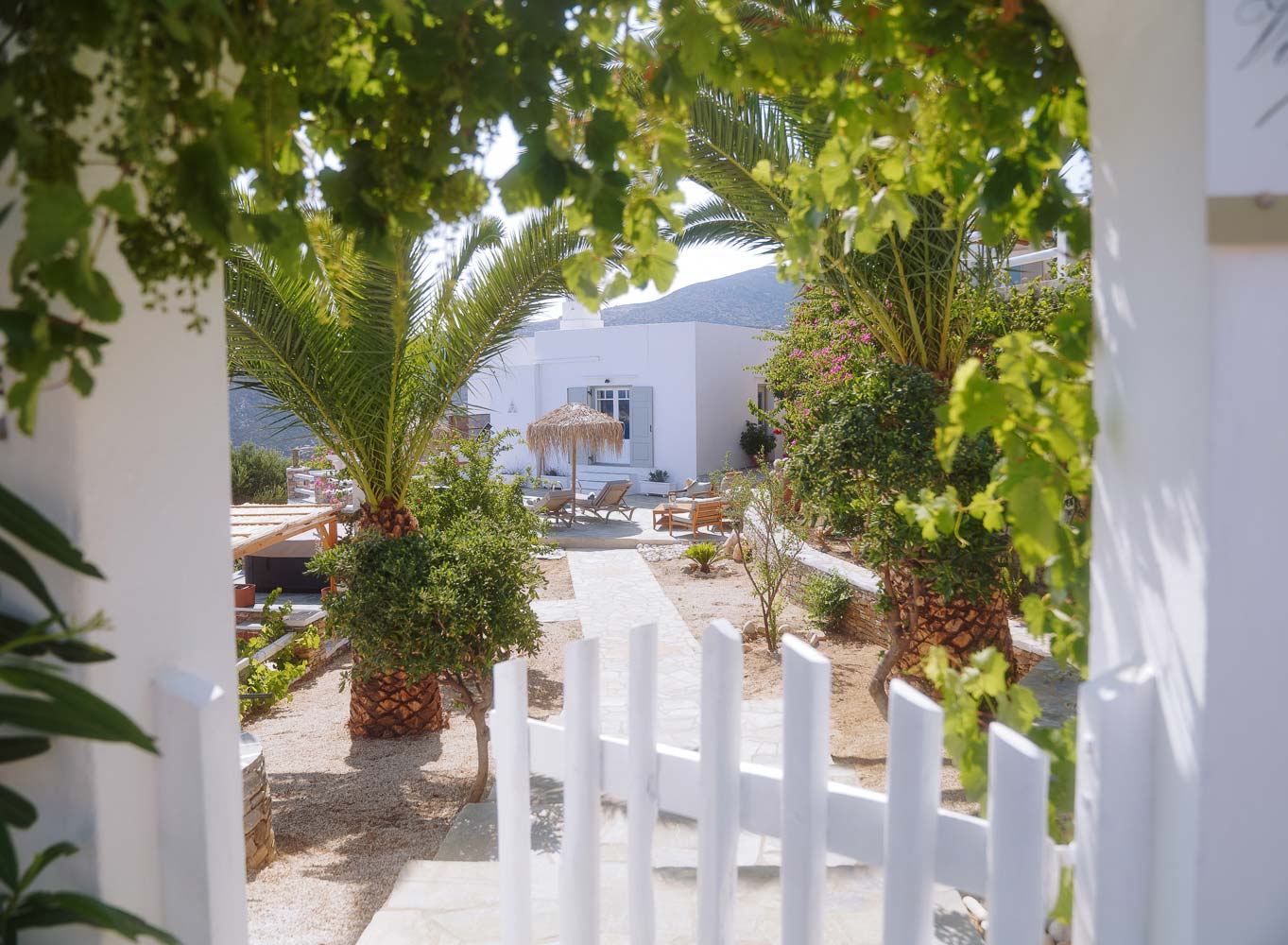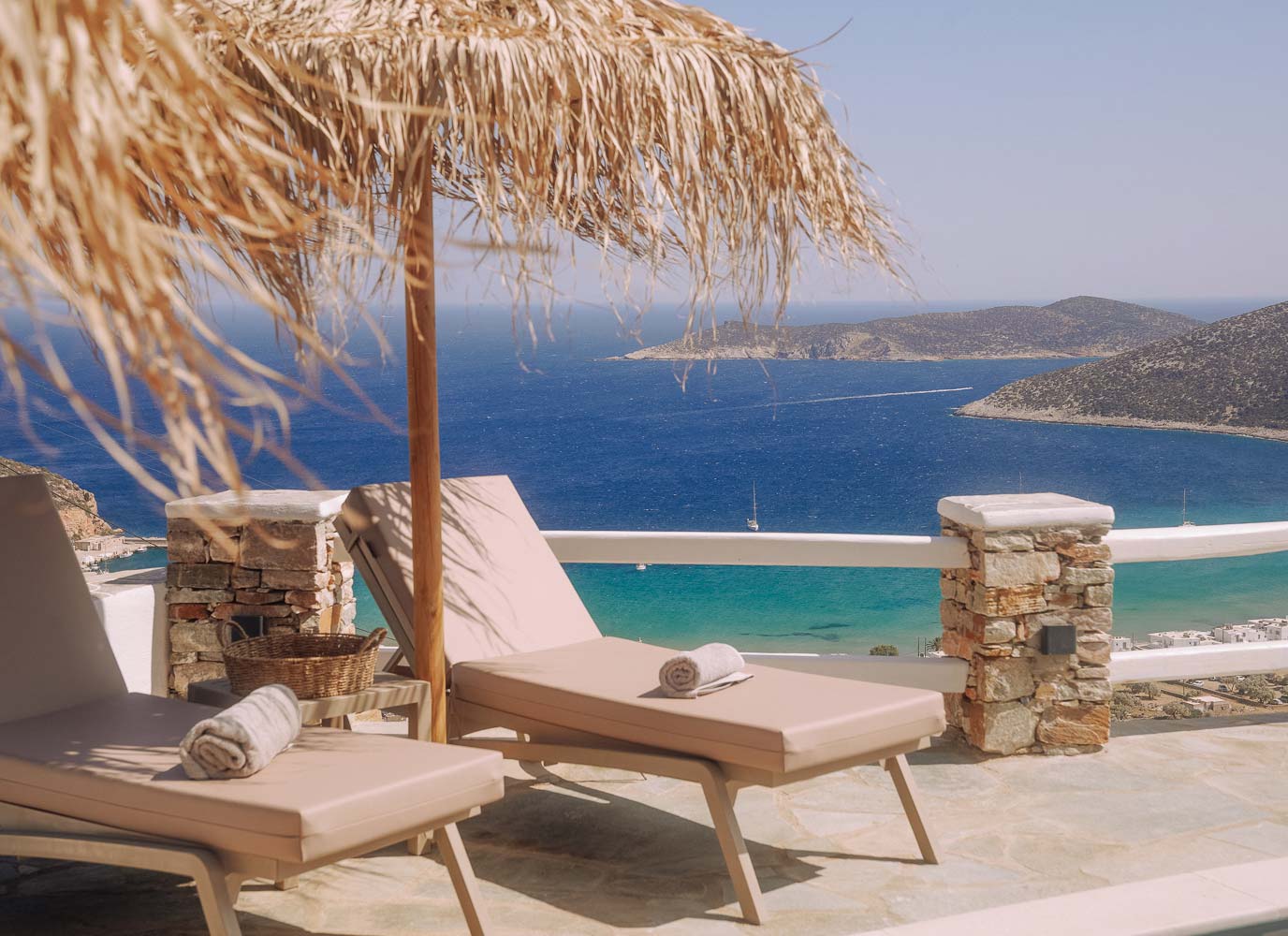 Μία μεγάλη σκιασμένη βεράντα, περιτρυγυρισμένη από φυτά και πολύχρωμα λουλούδια, με άνετα έπιπλα κι ένα μεγάλο καθιστικό εξωτερικού χώρου, προσφέρει πανοραμική θέα στον κόλπο του Πλατύ Γιαλού και στα γύρω νησιά. Δίπλα, βρίσκεται ο χώρος της πισίνας (30τ.μ.) με άνετες ξαπλώστρες για να απολαμβάνετε τον Κυκλαδίτικο ήλιο.